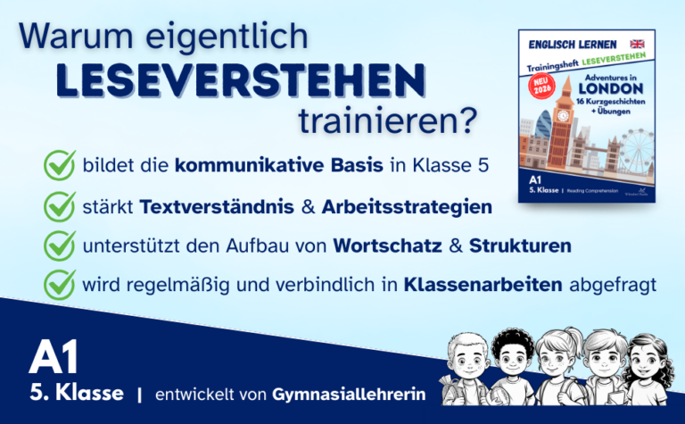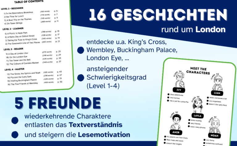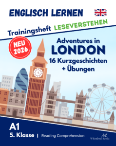 Adventures in London – Trainingsheft Leseverstehen bietet 16 kurze, kindgerechte Geschichten auf Niveau A1, die gezielt das Leseverstehen von Schülern der 5. Klasse fördern. Die Texte wachsen schrittweise von 150 bis 450 Wörtern und bilden eine klare Lernprogression ab. Mit jedem Level steigt auch der Anspruch der Aufgaben.